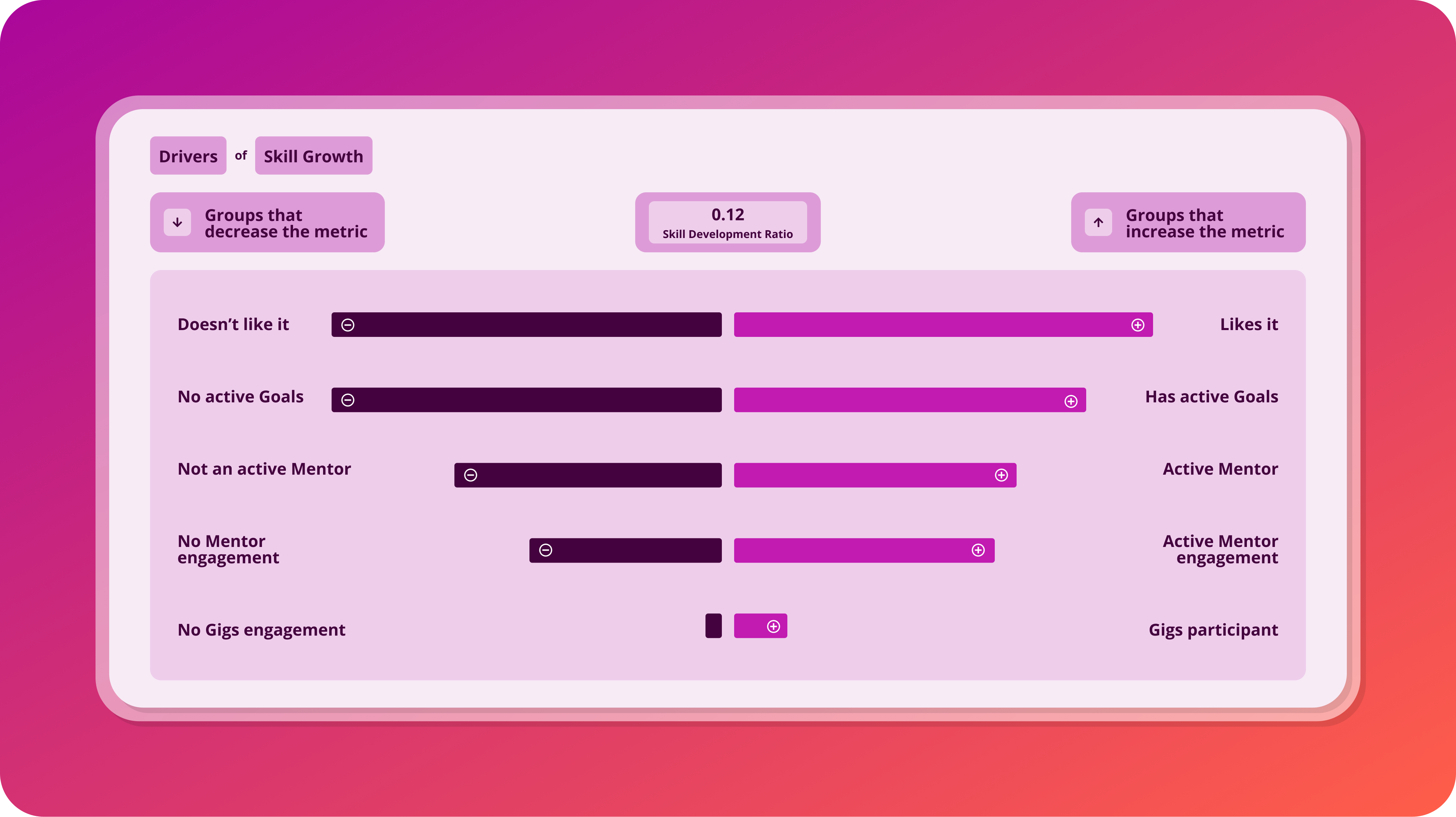 Compare what‑if scenarios across different adoption levels (10%, 50%, 100%+ uplift in key development actions like goals, mentoring, and gigs) to see how each path shifts projected skills growth over time.
